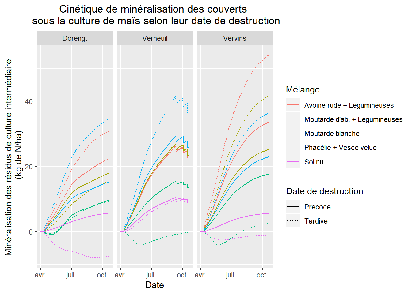 Par ailleurs, dans les simulations, les restitutions d’azote en cours de camapgne sont plus importantes pour les couverts détruits au printemps.