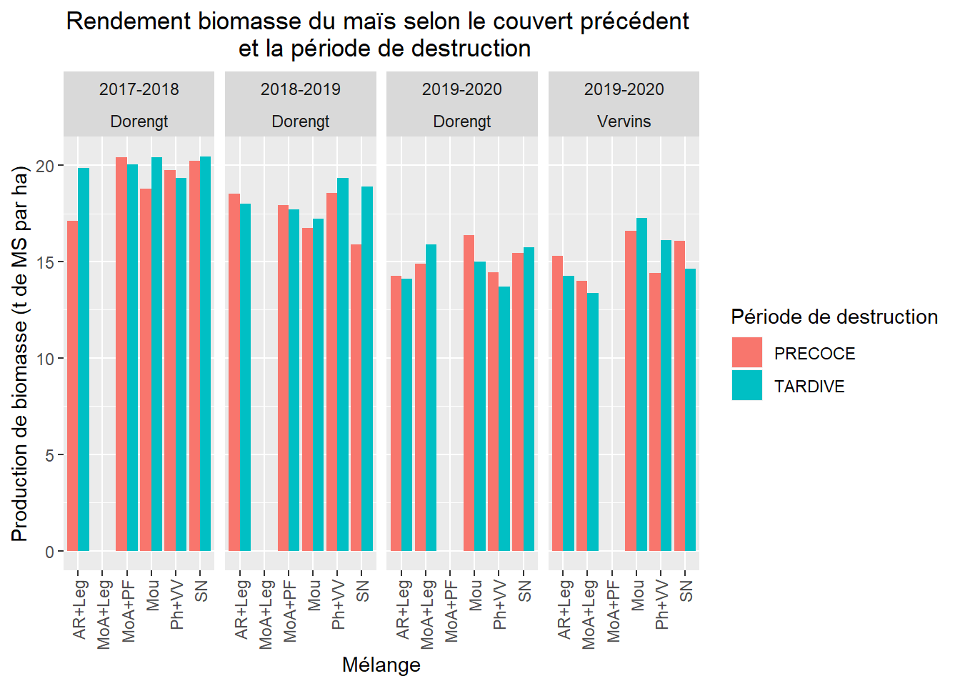 Dans nos essais, les couverts ont eu peu d’impact sur le rendement du maïs suivant. De plus, il est généralement négatif sur le rendement du maïs dans les conditions de l’essai. L’effet de la date de destruction est peu clair quant à lui car tantôt positif tantôt négatif.