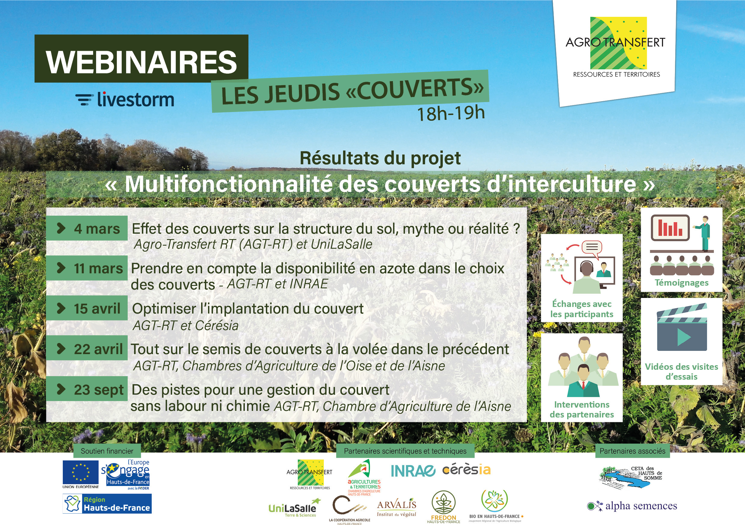 Rendez-vous les jeudis de 18h à 19 h pour des sessions thématiques d’une heure environ sur les couverts. Inscription sur le site internet d’Agro-Transfert.